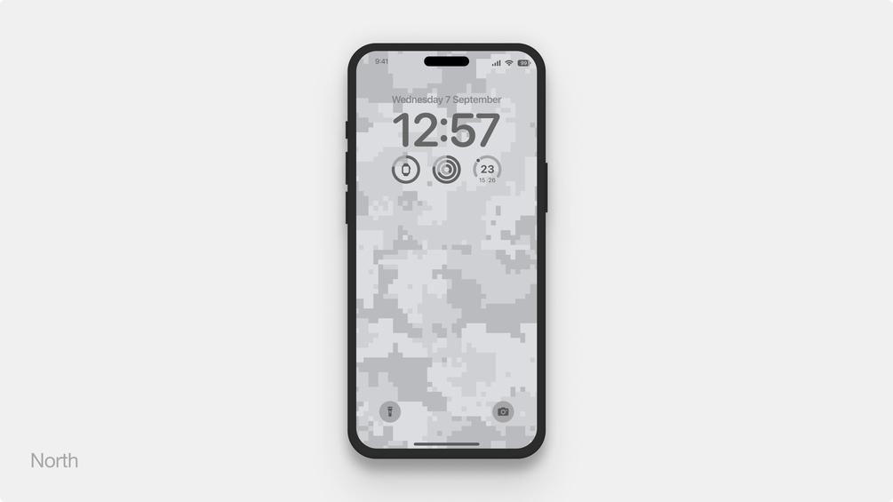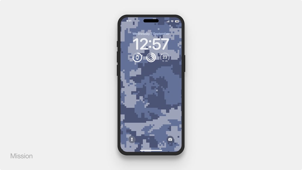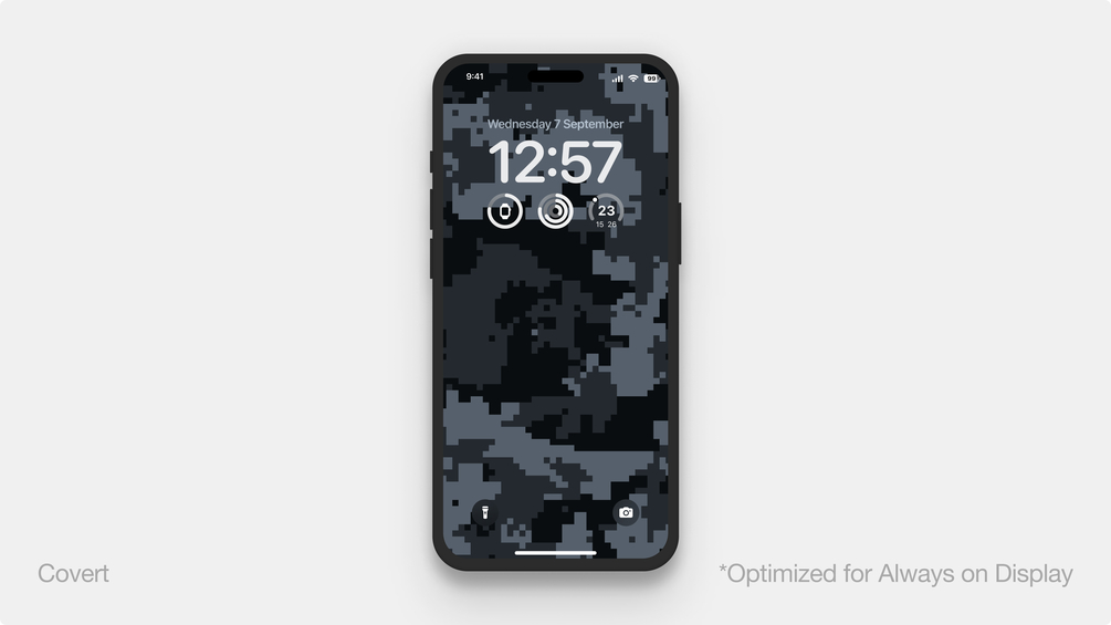 This series of mobile wallpapers features a digital camo design with 10 different colors. The Covert wallpaper is optimized for the iPhone 17 Pro & Pro Max's Always On Display and improves battery life.